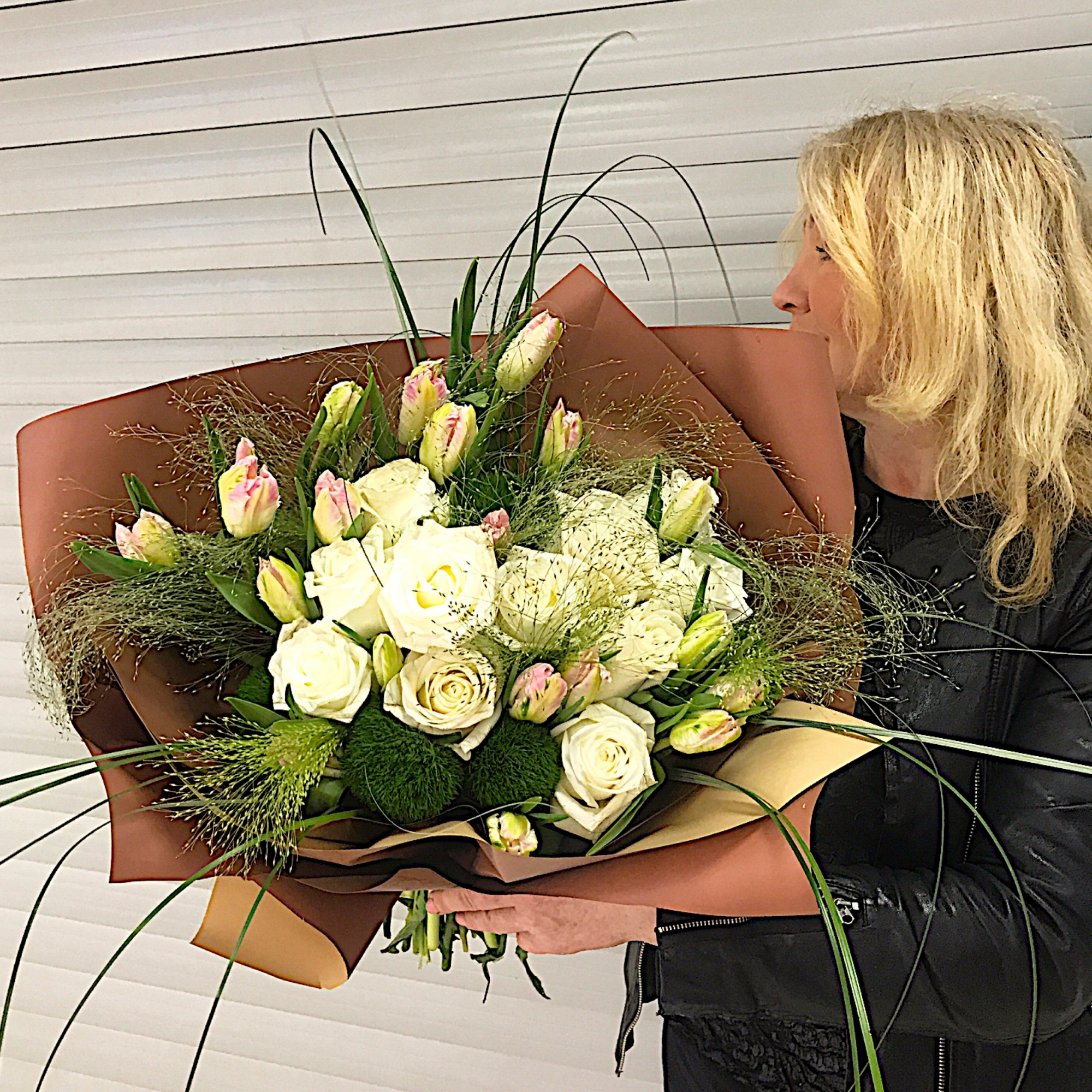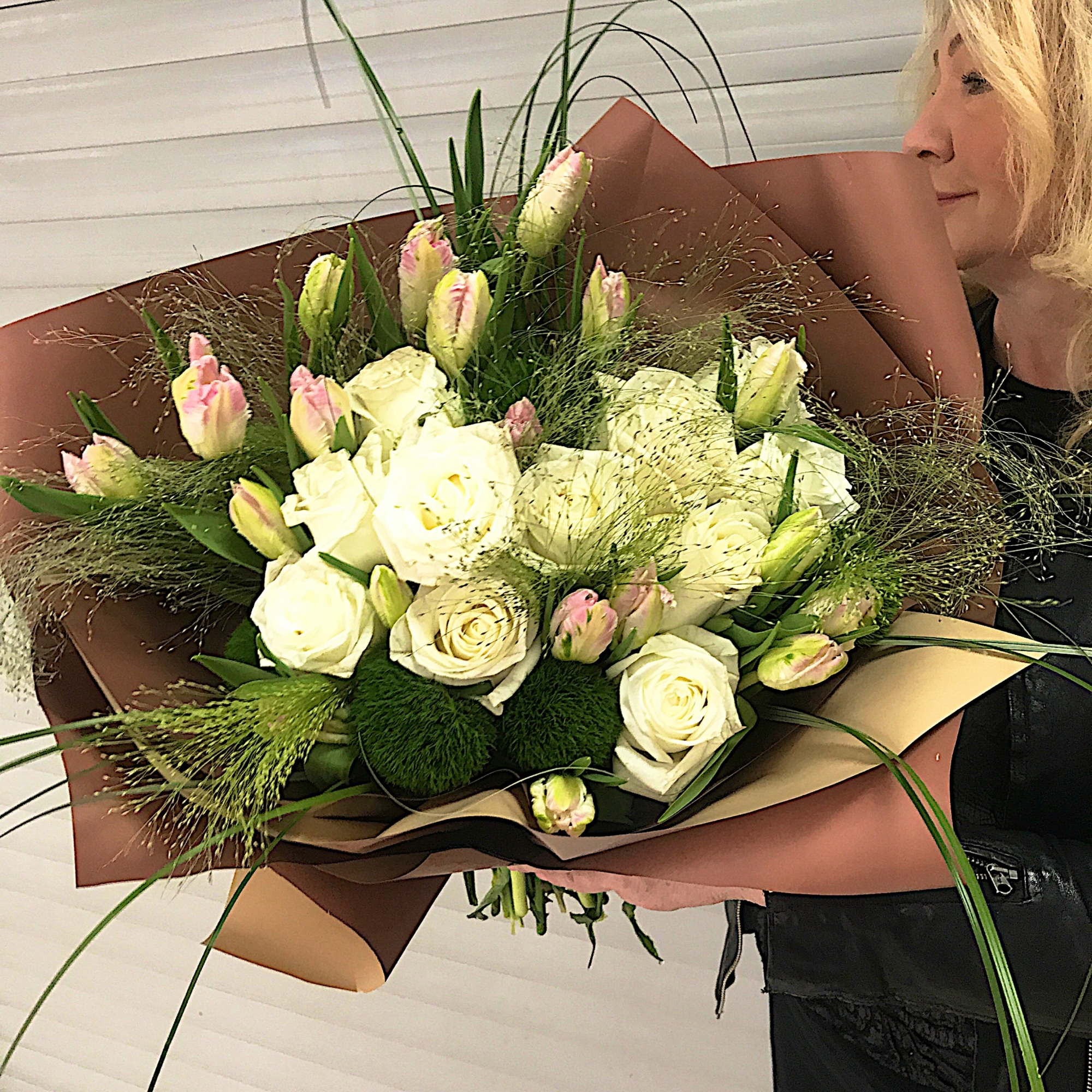 Паникум 3 шт, тюльпан 16 шт., роза 11 шт., гринтирик 2 шт.