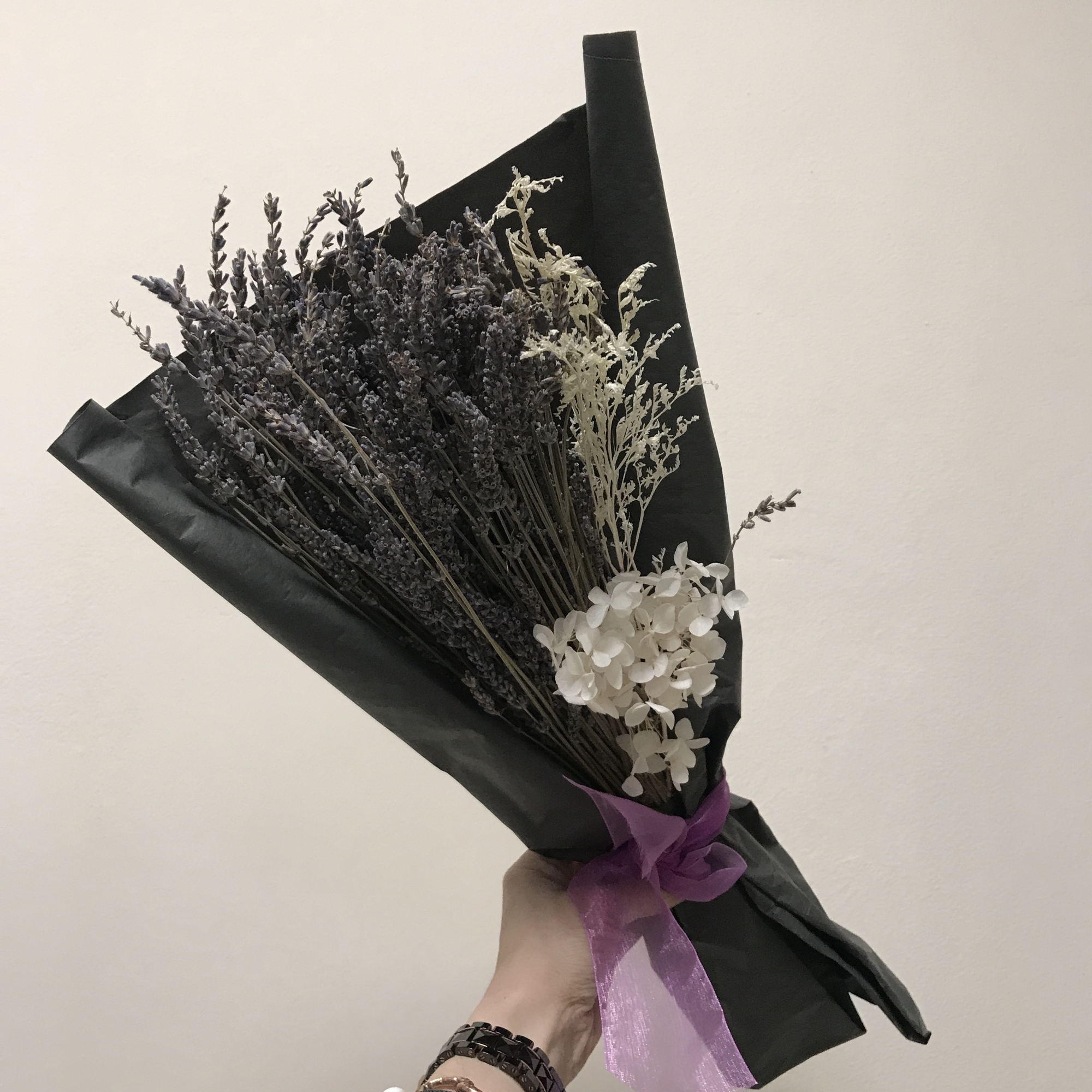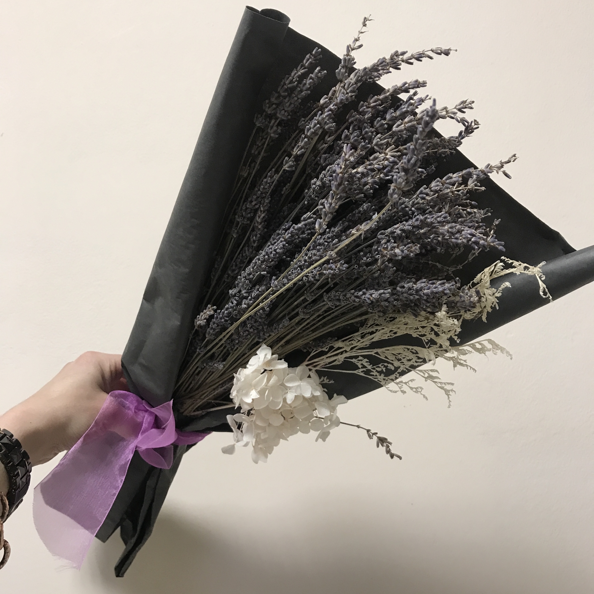 Букет из ароматной стабилизированной лаванды с веточками лимониума и гортензией