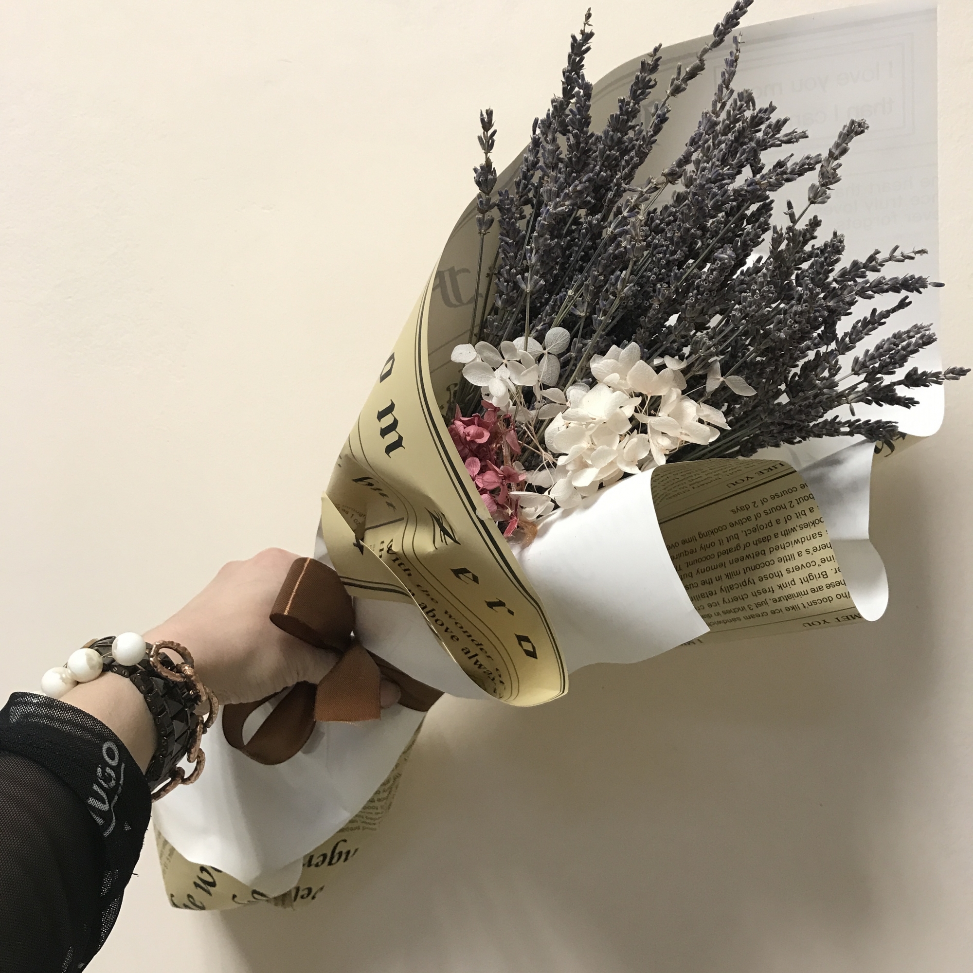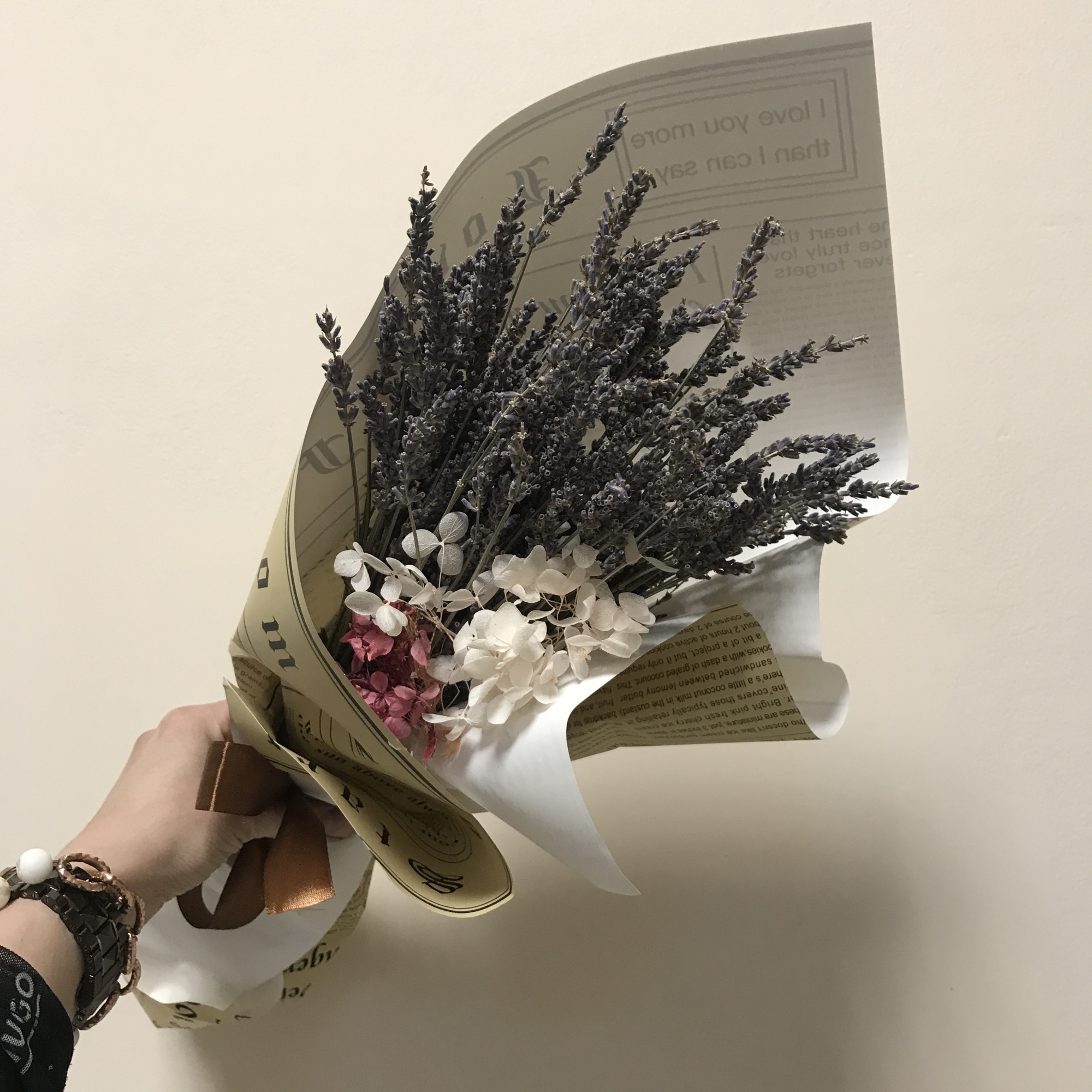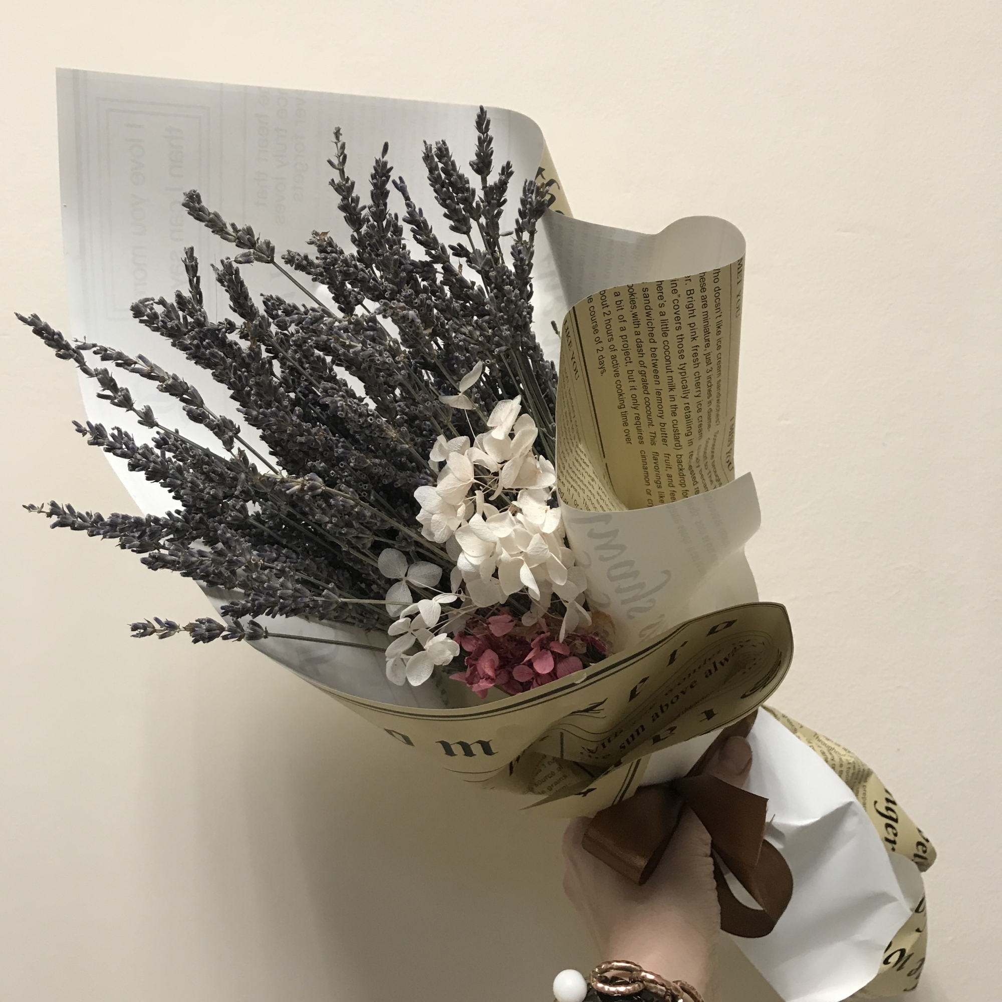 Букет из натуральной стабилизированной лаванды с веточкой нежной стабилизированной гортензии.