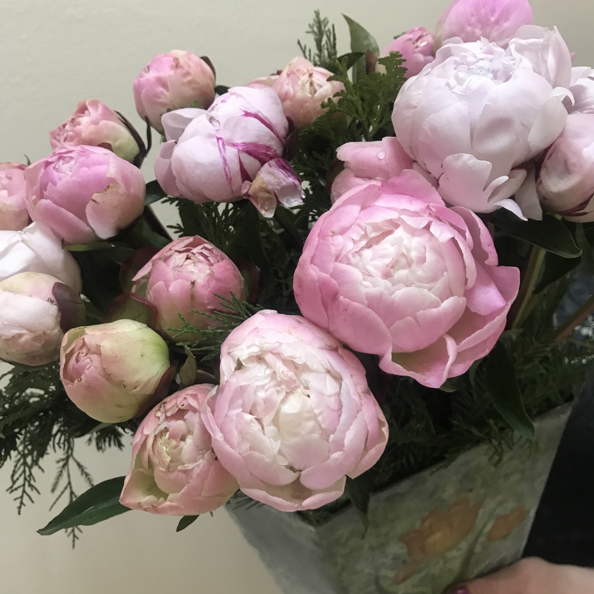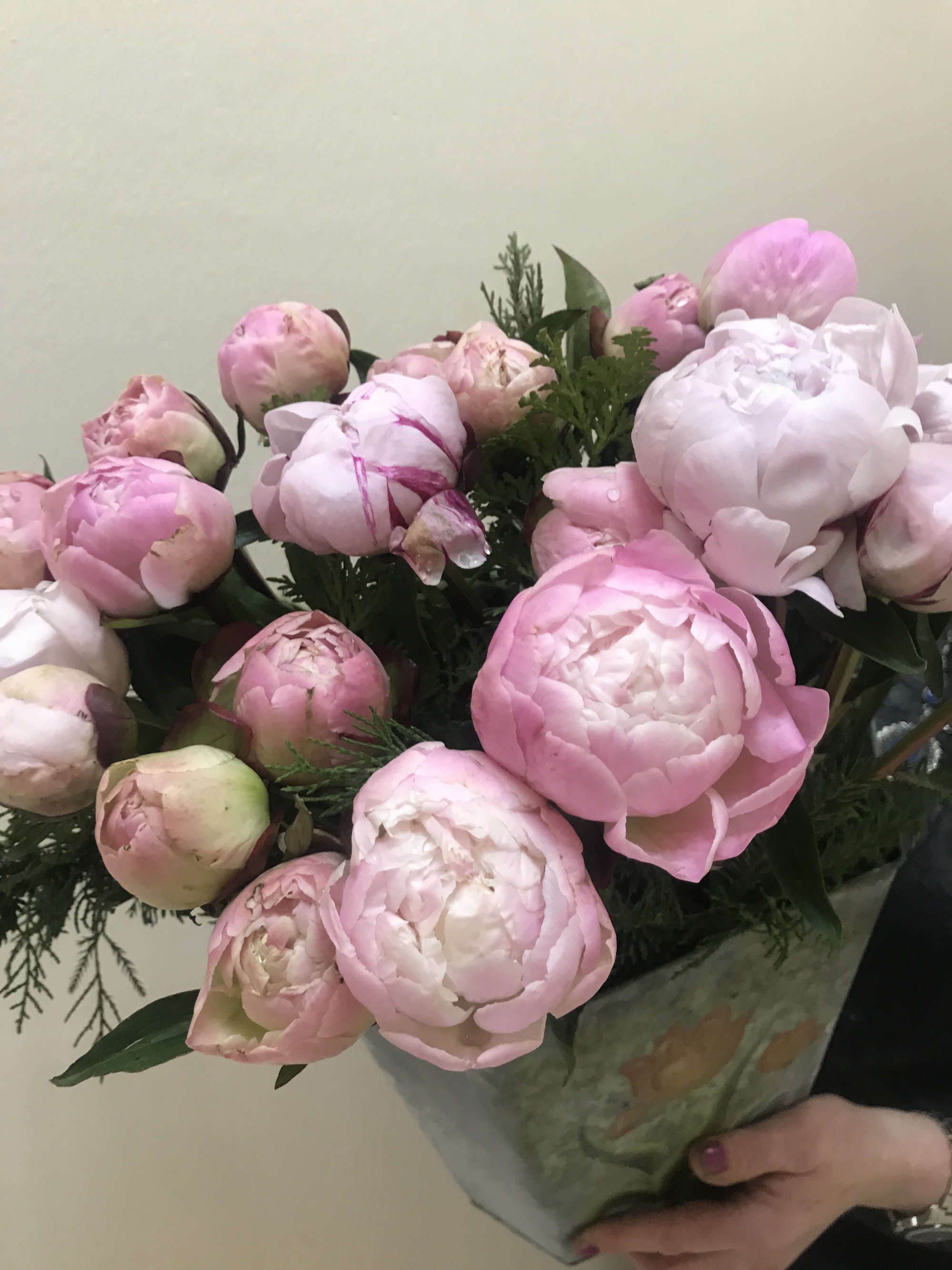 21 розовый пион в стильном кашпо