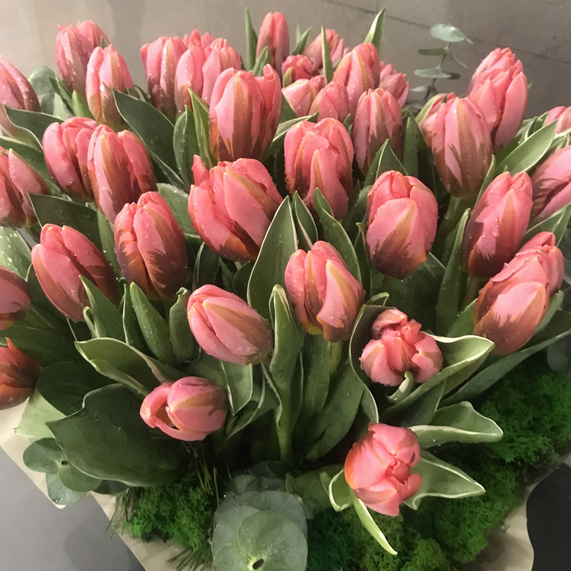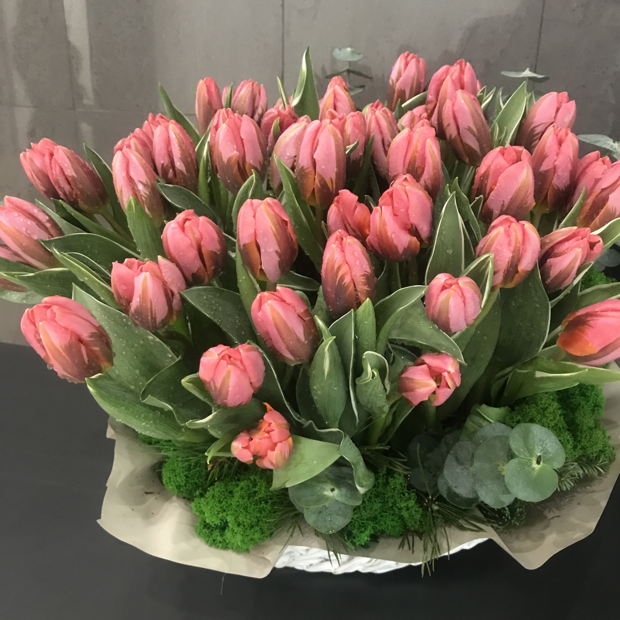 25 тюльпанов, эвкалипт, стабилизированный мох