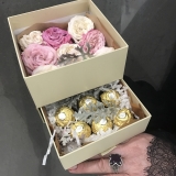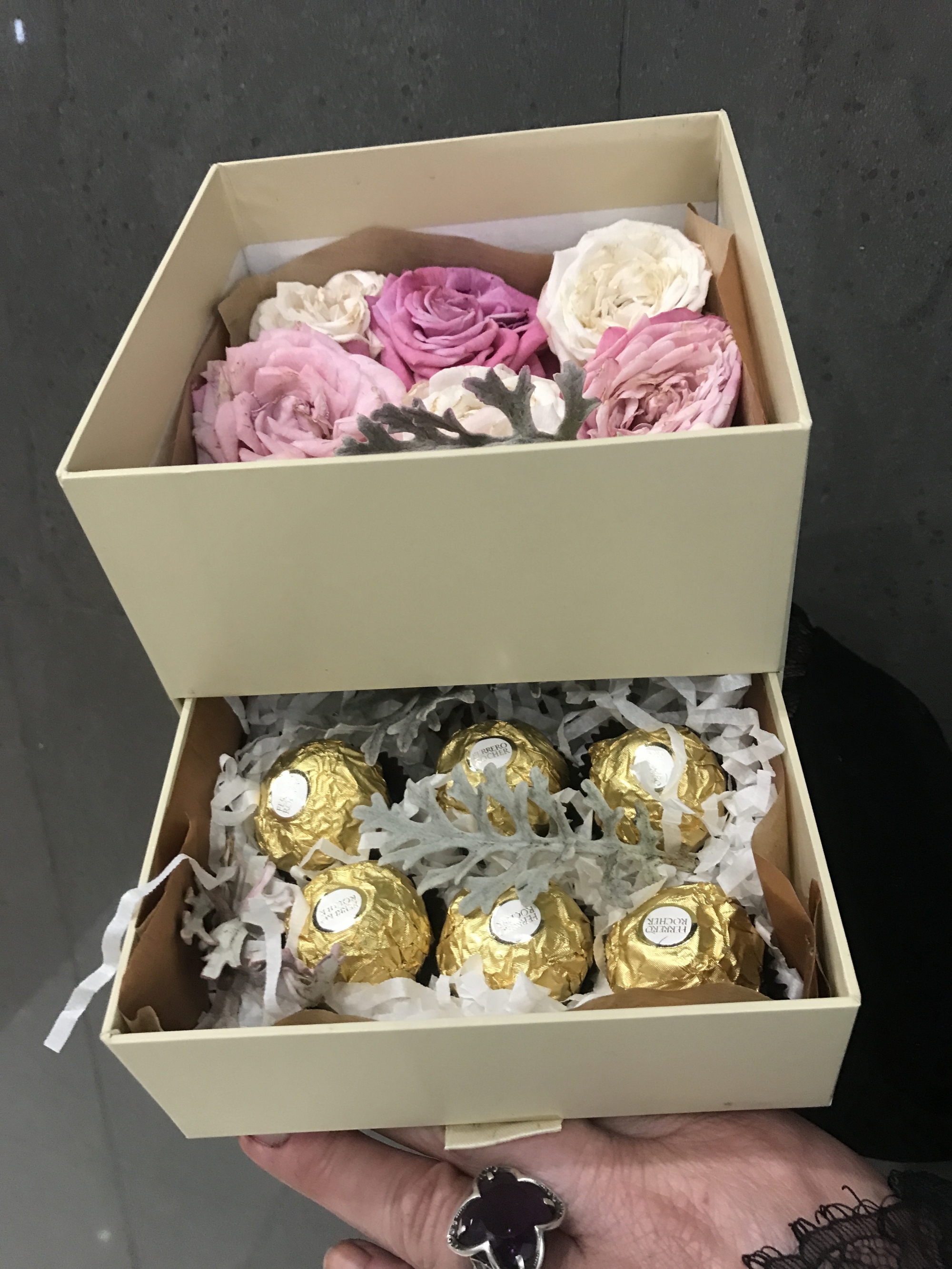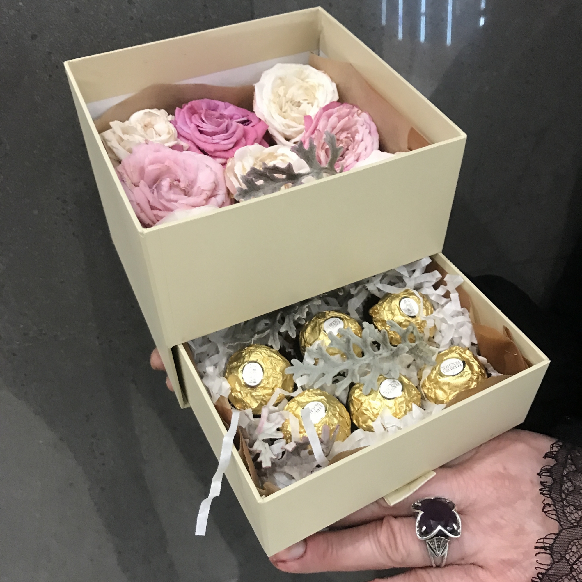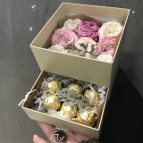 Роза кустовая 3 шт., конфеты Ferrero Rocher 6 шт., коробка с выдвижным ящиком 1 шт.