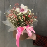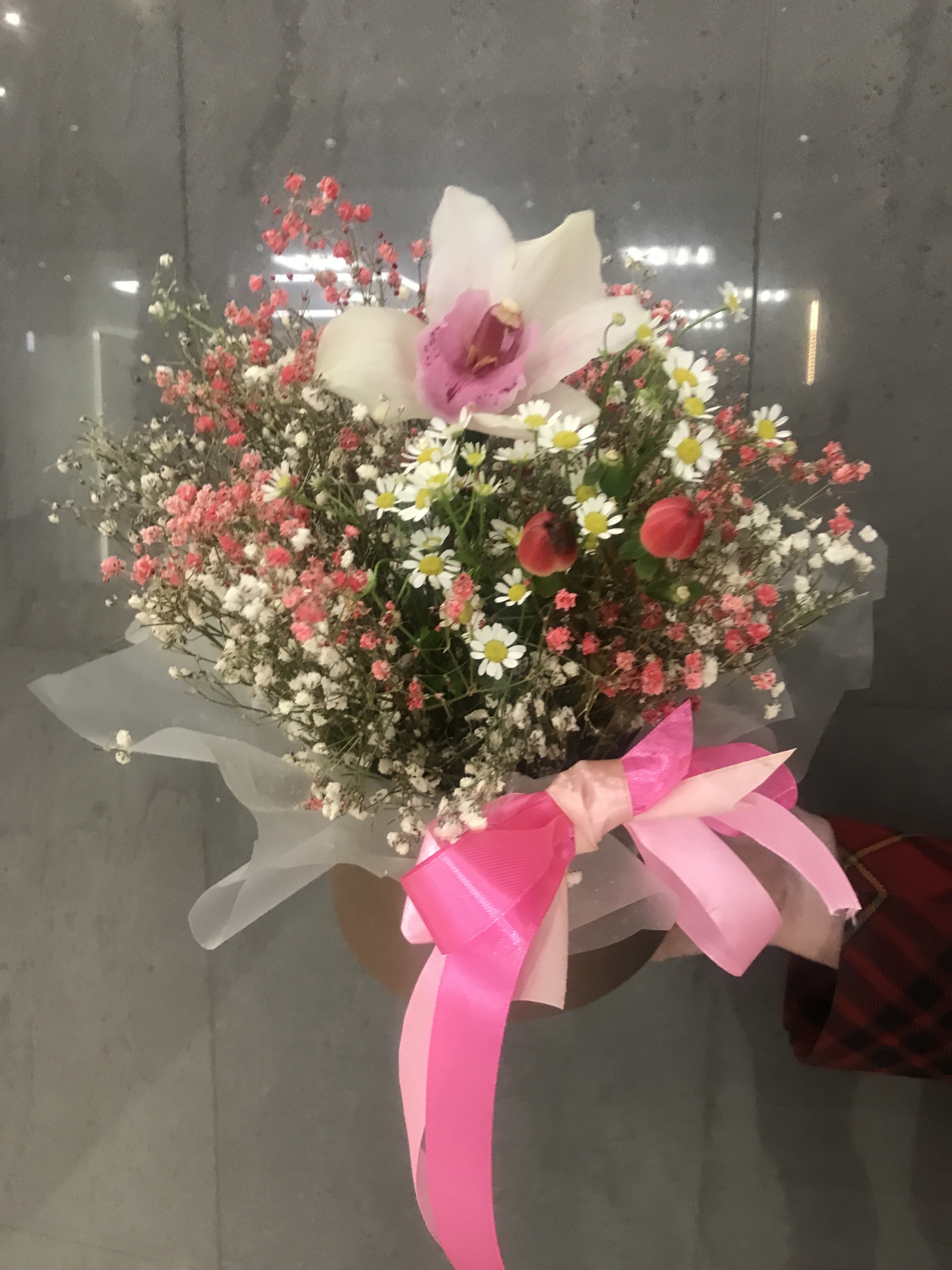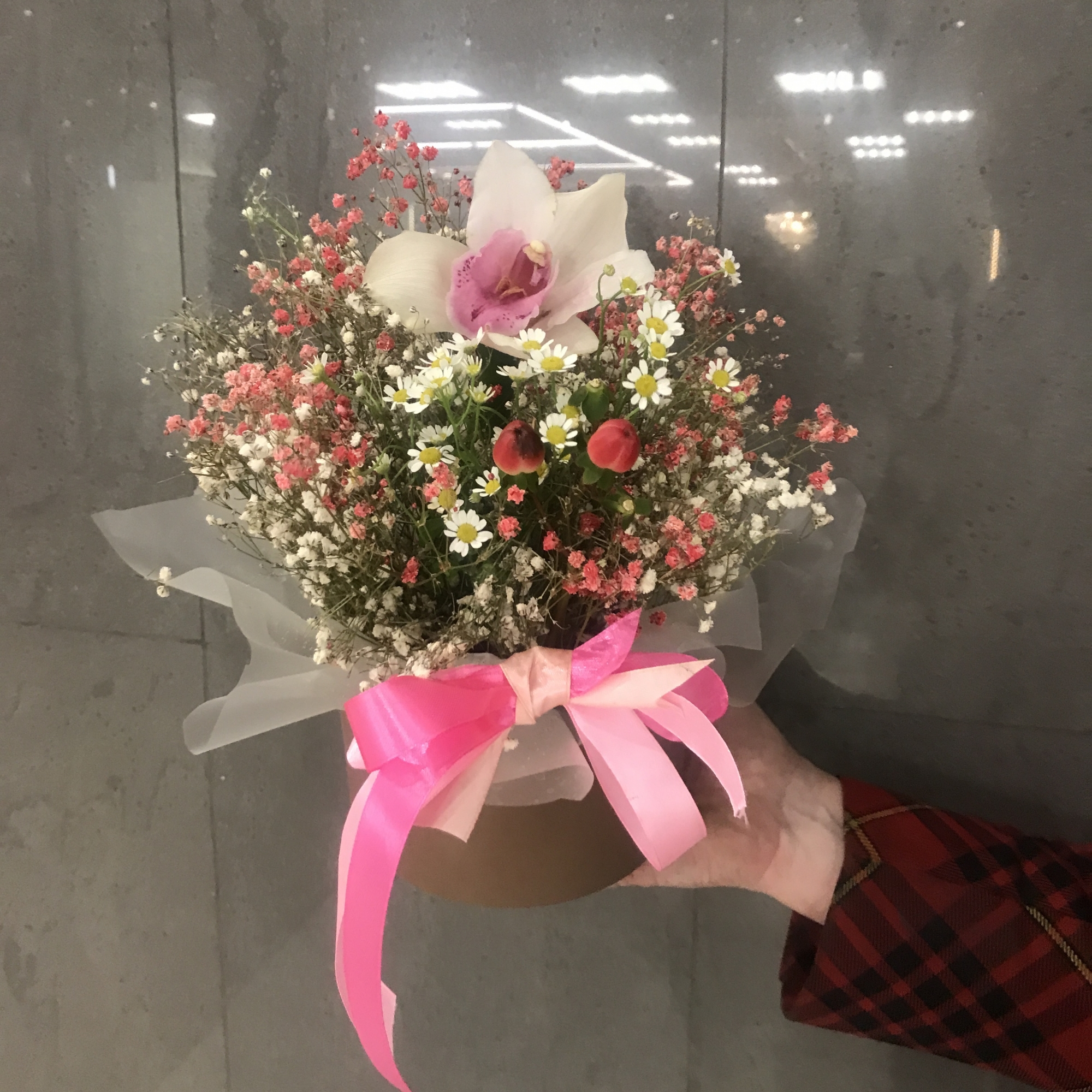 Гиперикум 1 шт., гипсофила 2 шт., орхидея цимбидиум 1 шт., коробка шляпная 1 шт., матрикария 1 шт.