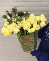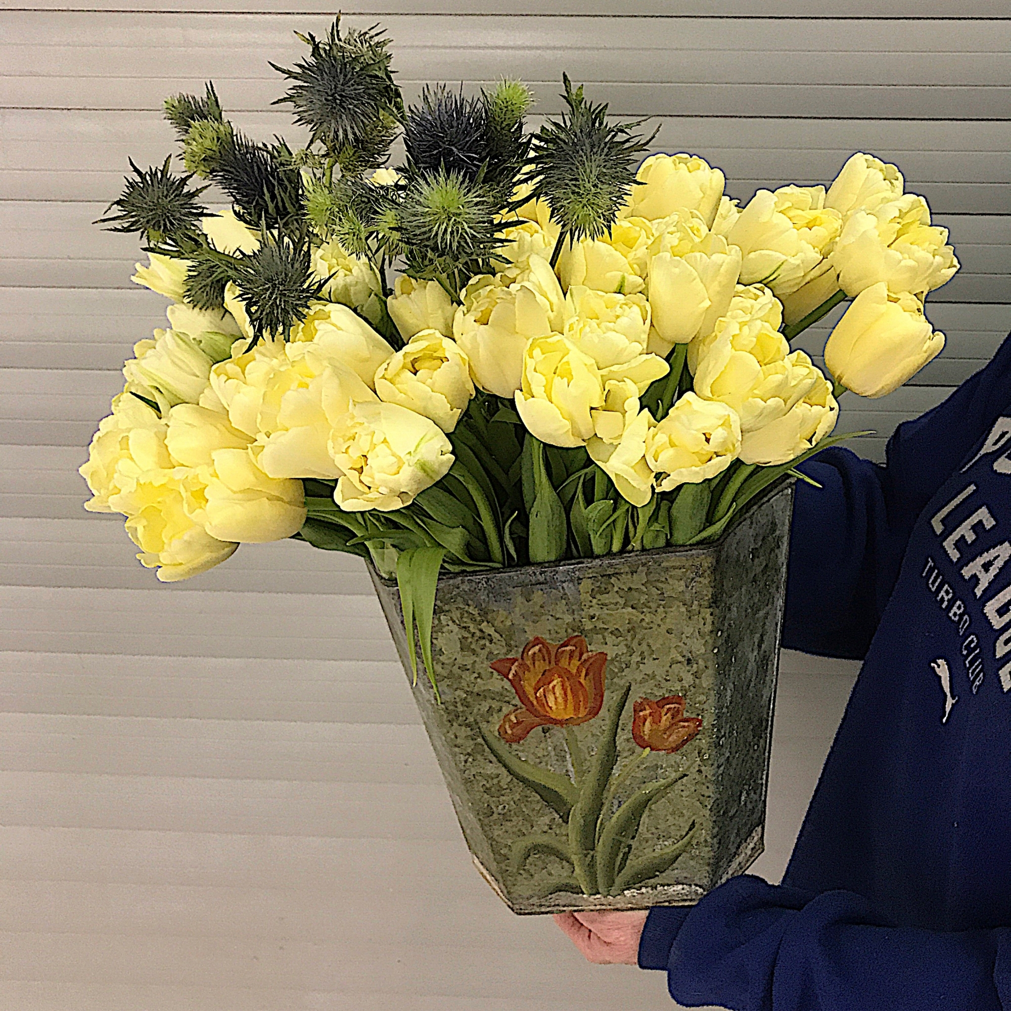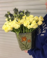 Тюльпан 51 шт., чертополох 5 шт., кашпо жестяное 1 шт.