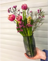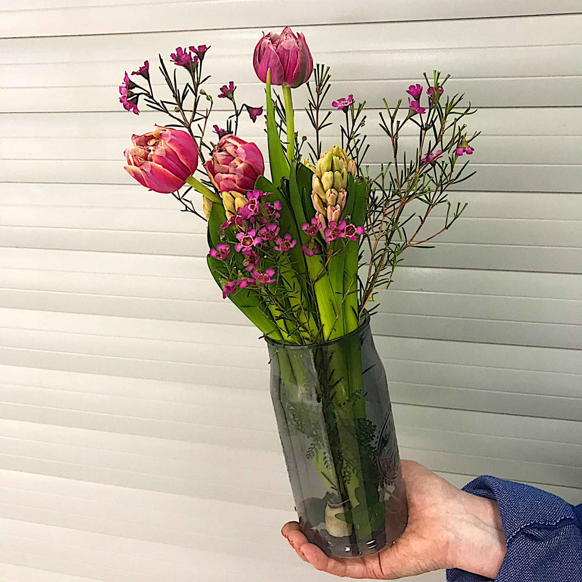 Гиацинт 5 шт., тюльпан пионовидный 3 шт., вереск 1 шт., ваза пластиковая 1 шт.
