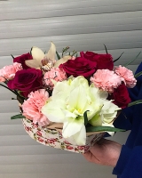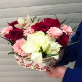 Лилия 1 шт., орхидея цимбидиум 1 шт., роза 5 шт., гвоздика 6 шт., коробка сердце 1 шт.