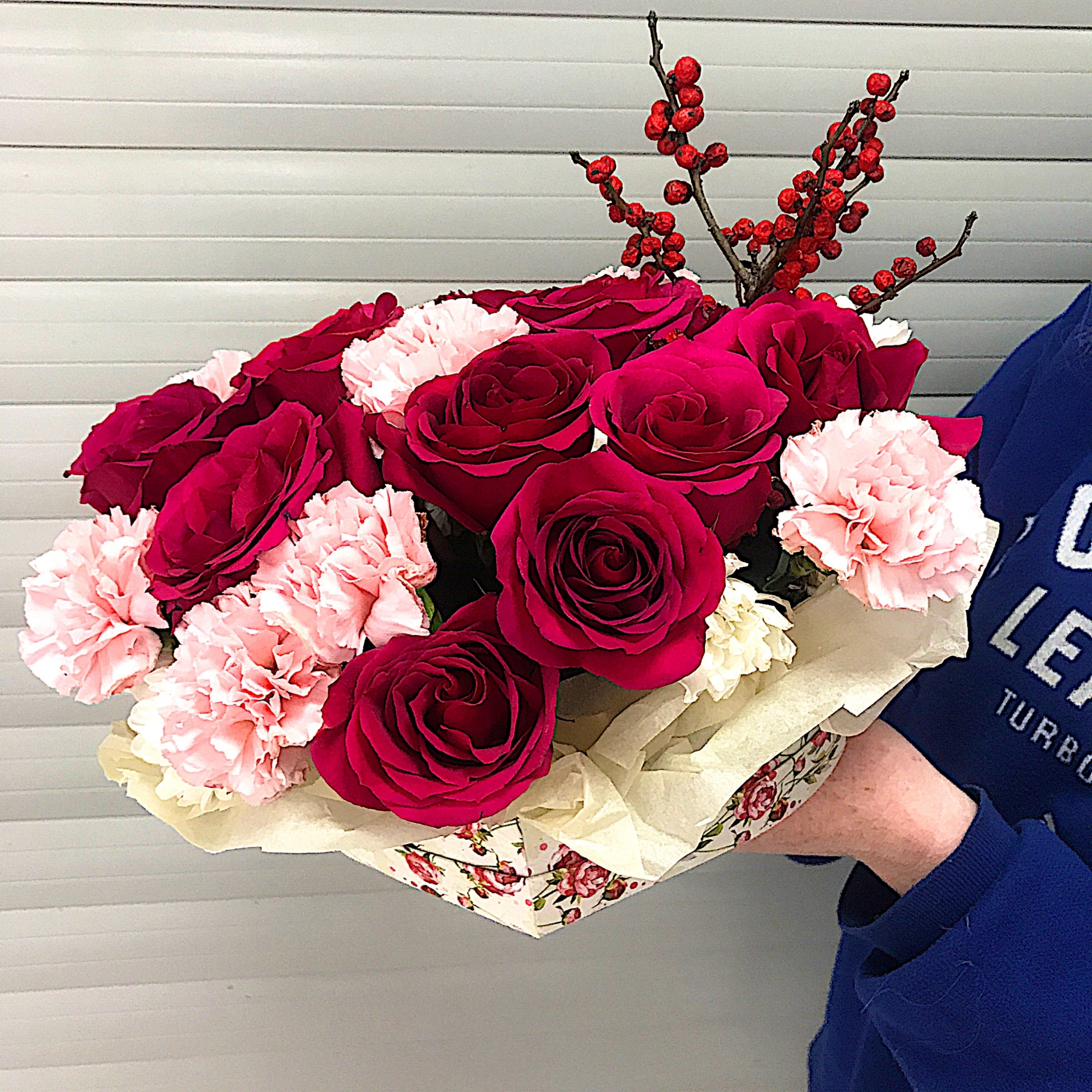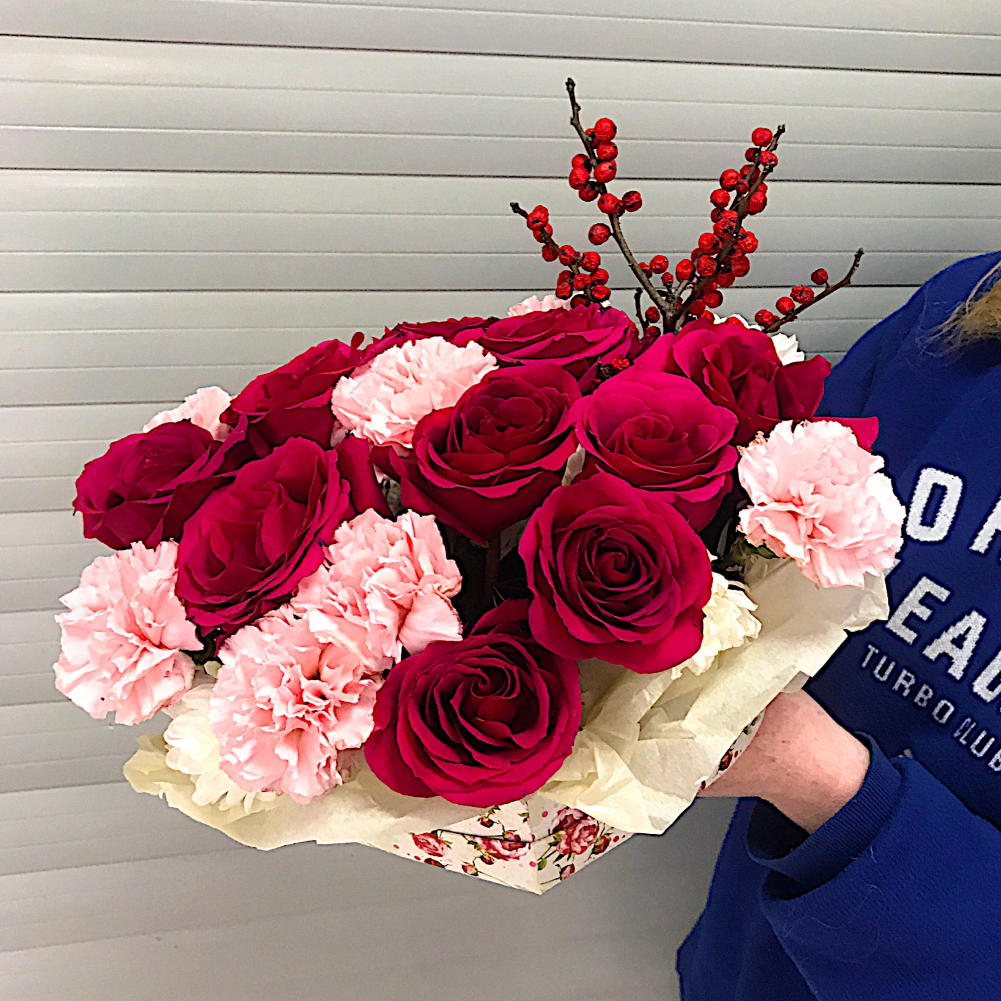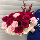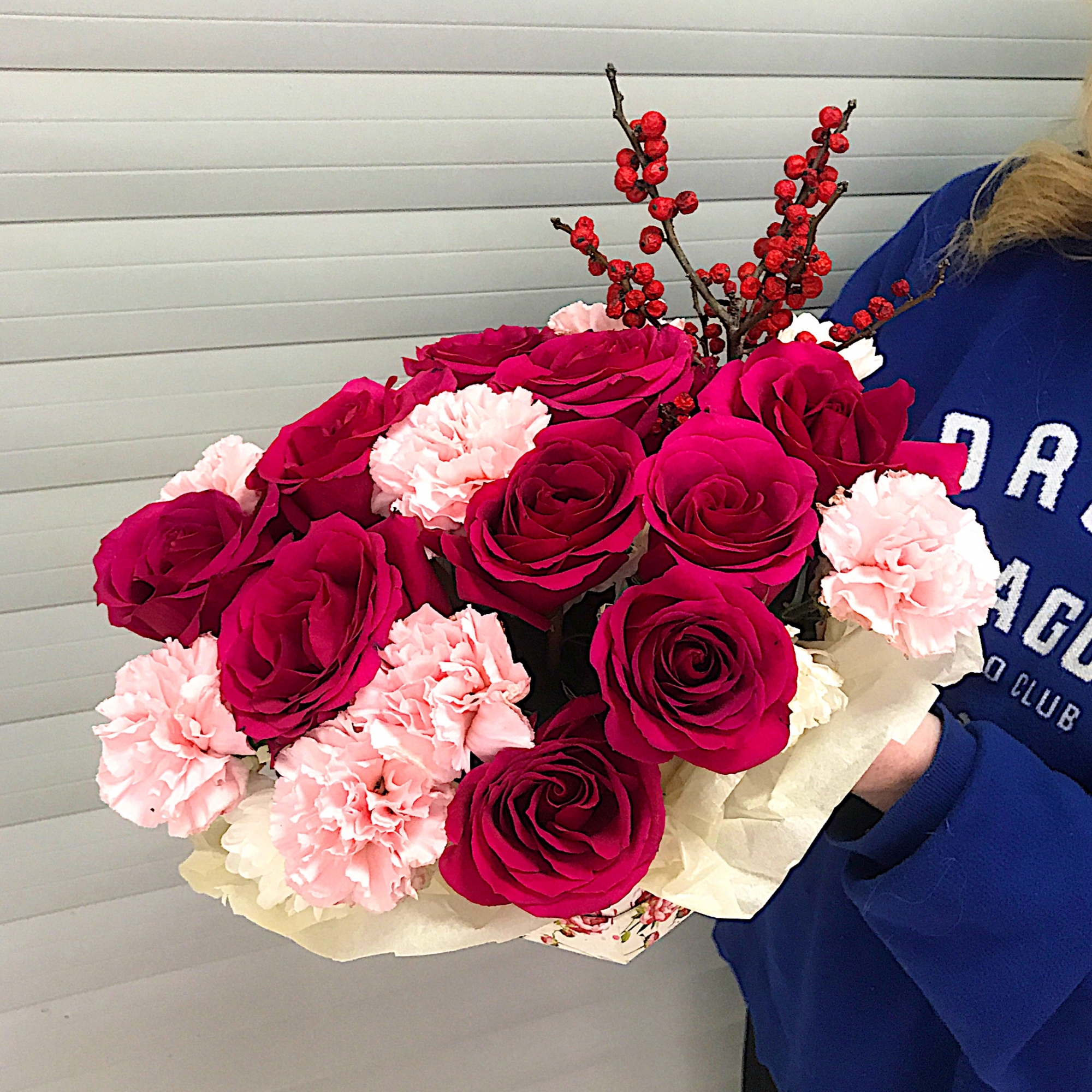 Роза 11 шт., гвоздика 8 шт., коробка сердце 1 шт.