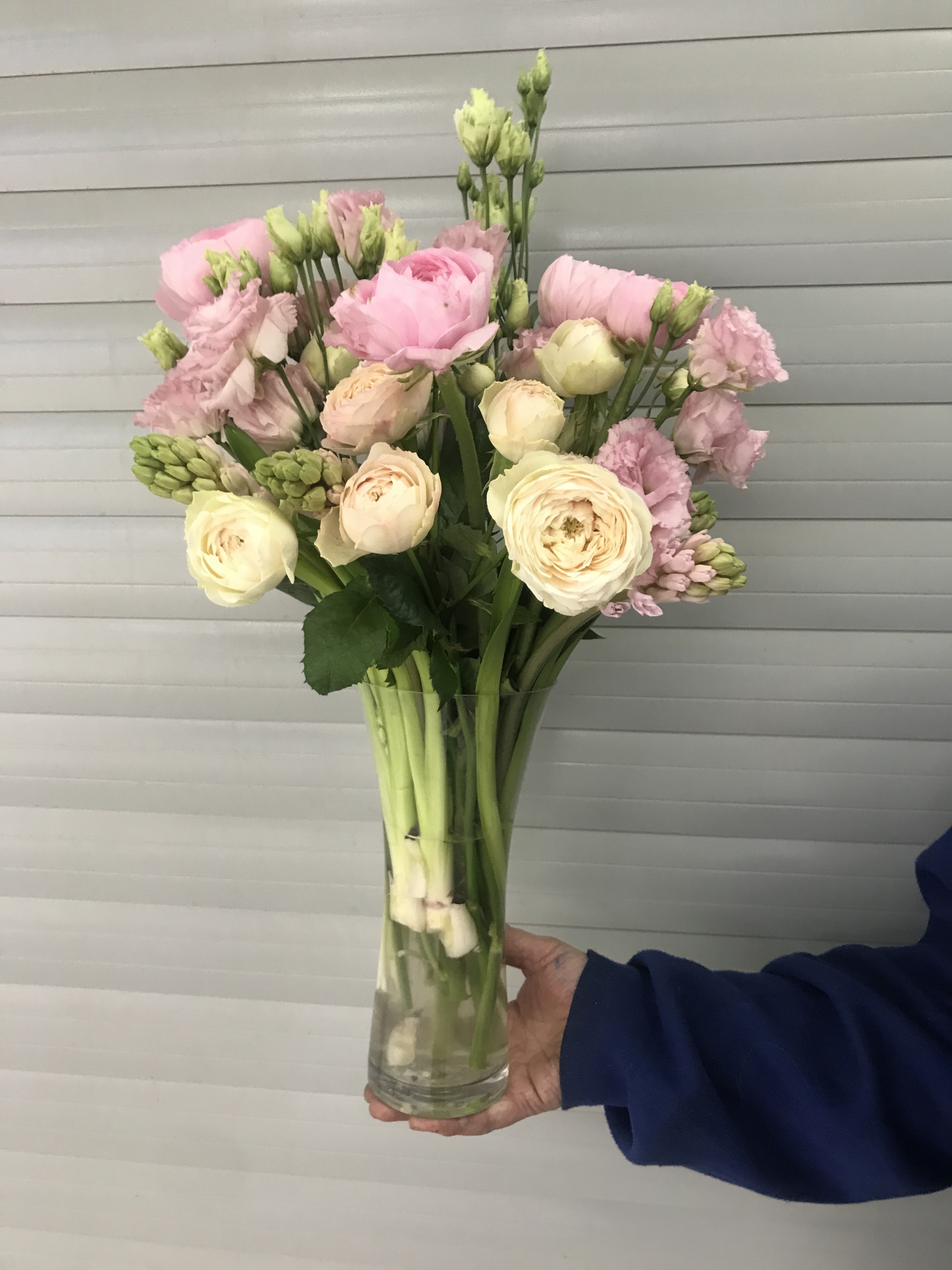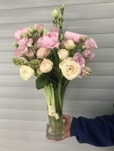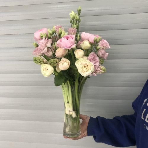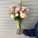 Роза кустовая 3 шт., эустома 3 шт., ваза стекло 1 шт., гиацинты 3 шт., ранункулюс 5 шт.